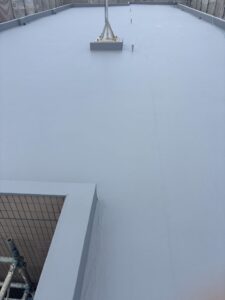 その後、ウレタン防水材を塗布し、防水層を形成しました。複数回の塗り重ねを行い、十分な厚みを確保することで、耐久性・防水性ともに優れた屋上へと生まれ変わります。